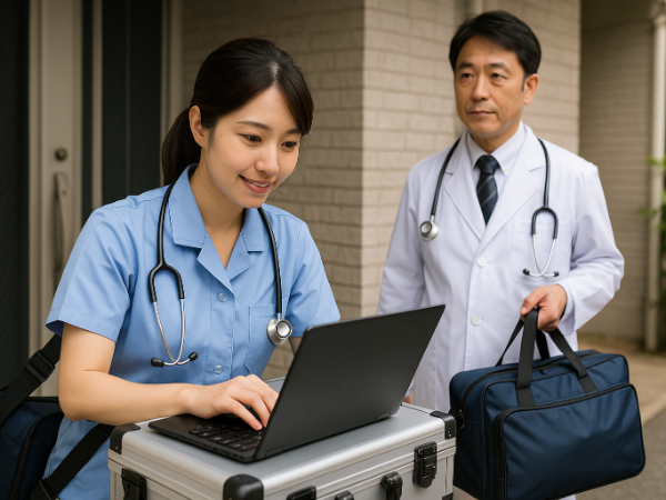 訪問診療では、医師と一緒に患者宅や施設を訪問し診療が行われます。診療中にはカルテ入力を担当し、医師が診療に集中できるよう補助します。医療器材の準備や搬送も担当し、訪問前後の準備を行います。採血や処置のサポートを行う場面もあり、医師の指示に従い必要な補助作業を担当します。